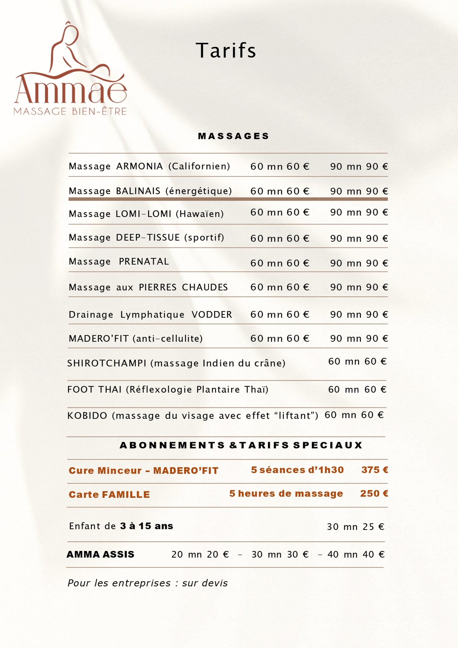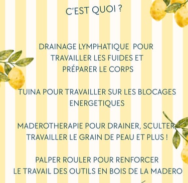 Les massages sont des techniques manuelles de bien-être, ils offrent détente et relaxation. Ils n’ont pas de but thérapeutique et ne s’apparentent pas à la pratique de la masso-kinésithérapie. Ils ne présentent, par ailleurs, en aucun cas de caractère érotique ou sexuel.